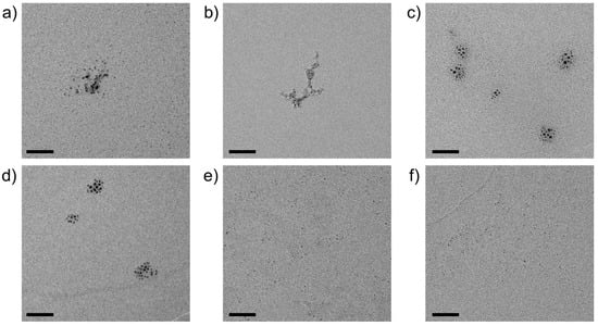TEM micrographs of silica-coated nanoparticles of (a) CdS, (b) CoS, (c) CuS, (d) MnS, (e) NiS, and (f) ZnS, obtained by spontaneous co-precipitation from solutions containing 10 mM each of metal chloride, Na2S, and sodium silicate, at the respective native pH. Scale bars: 50 nm.