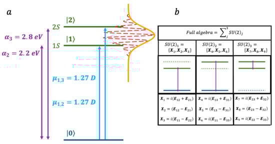 This three-level system corresponds to three coupled qubits, described by three coupled algebras with nine generators, three for each pair of levels: for the GS and 1S, for the GS and 2S and for 1S and 2S. Note that, in this case, the three pairs of levels each have a state in common. The commutation relations between the nine operators are given in Table S3 of the Supplementary as well as the explicit functional form of the three-state time correlation matrix (Equation (35), see Supplementary, Section S3.3)) and an example of the dynamical symmetries’ dependence on of the (Equation (34), see Supplementary Section S3.4).