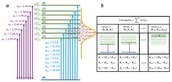 (a) Level structure of the dimer of Cdse nanoparticles. The ground states are coupled to eight excited states (, , , , , , and ) by optical excitation. (b) the generators of the nine-level system is constituted of 36 algebras.