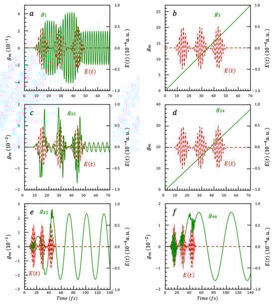 We show in Figure 2a–c the computed time dependence of the pairs of coefficients, , and that correspond to the pairs of generators , and describing the real and imaginary parts of the electronic coherences. and which corresponds to the operators associated with the population differences , and are plotted in Figure 2d. After the pulse, the , and coefficients oscillate between constant values while the and increase monotonically with a step-fine structure.