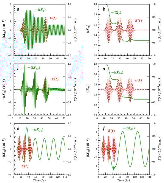 Since the initial state is the ground state, only two dynamical symmetries have a mean value different from 0, , all the other = 0. As for the three-level system discussed in Section 6.1, only two columns, the third and the sixth ones, of the time correlation from the Schrödinger to the Heisenberg picture, Equation (35), need to be derived to propagate the observables, meaning 216 coefficients out of 1082 = 11,664. The time dependence of corresponding to the plotted in Figure 5 are plotted in Figure 6. Note that each depends on several .