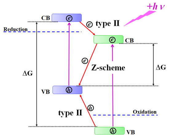 In general, there are two different possible mechanisms of charge separation at the heterojunction of the type II heterostructure: the conventional type II mechanism, when electrons transfer from the CB of SC1 to the CB of SC2 and holes migrate from the VB of SC2 to the VB of SC1, and the Z-scheme mechanism, when electrons from the CB of SC2 recombine at the heterojunction with holes in the VB of SC1 (see Figure 1). A distinguished advantage of the Z-scheme compared to the conventional type II mechanism is that the total driving force |∆G| to initiate redox reactions in the Z-scheme is higher than the corresponding driving forces of individual components, whereas for the conventional type II mechanism, the total driving force of the heterostructure is less than the driving forces of individual components (see Figure 1). For example, to split water, the CB of the SC must be located at a potential more negative than the H+/H2 reduction potential, while the VB must be more positive than the oxidation potential H2O/O2 (1.23 V relative to the normal hydrogen electrode) [9]. In this context, the extended range of the heterostructure total driving force allows for more redox reactions to be initiated. This makes heterostructures realizing the Z-scheme mechanism more favorable as heterostructured photoactive materials.