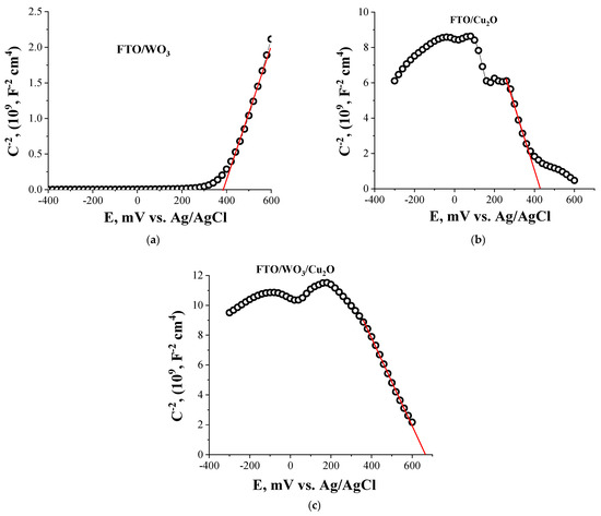 Figure 3 demonstrates Mott–Schottky plots for FTO/WO3 (a), FTO/Cu2O (b) individual component electrodes, and the FTO/WO3/Cu2O heterostructured electrode. The positive slope in the Mott–Schottky plot for WO3 indicates the n-type conductivity of the SC, while, accordingly, the negative slope observed for the Cu2O Mott–Schottky plot corresponds to the p-type conductivity. The flat band potential of the electrodes was evaluated by extrapolating the Mott–Schottky plot slope to the X-axis. The corresponding values of the flat band potentials are 387 mV (vs. Ag/AgCl) for FTO/WO3 and 427 mV (vs. Ag/AgCl) for FTO/Cu2O electrodes.