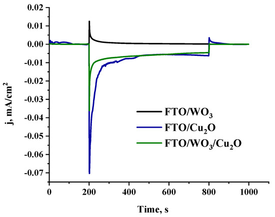 Figure 4 demonstrates the chronoamperometric dependences of the photocurrent for the FTO/WO3, FTO/Cu2O, and FTO/WO3/Cu2O electrodes under visible light irradiation without external bias.