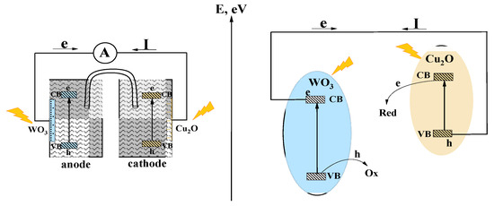 To establish how photoexcitation conditions affect the type of charge separation mechanism at the type II heterojunction, in this study, we explored a heterostructure formed by WO3 and Cu2O in a photoelectrochemical water-splitting reaction. In addition, we also performed studies of photoelectrochemical behavior in a tandem photoelectrochemical cell with tungsten oxide acting as a photoanode and copper(I) oxide being a photocathode. The selection of these two components of the heterostructure is dictated by their well-established electronic and photoelectrochemical properties [19,20,21,22].