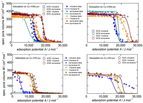 For the analysis of the equilibrium sorption isotherms of the studied systems, the Dubinin approach [51,52] is used as in previous studies for the MOF systems under investigation [44,45]. It has the advantage of enabling the analysis of sorption equilibria at different temperatures at once, enabling an easy and quick identification of key differences in sorption equilibria for different sorptive–sorbent systems. Figure 1 presents the band of isotherms for the ad- and desorption of the studied C4-hydrocarbons on Cu-IHMe-pw and Cu-IHEt-pw for the temperatures 283, 298 and 313 K in a characteristic Dubinin plot, each showing the specific pore volume in dependence of the sorption potential . Furthermore, every resulting characteristic curve for each pair of adsorbent and adsorptive as well as adsorption and desorption was fit with a dual-volume Dubinin–Asthakov approach, as was carried out previously [44,45]. These fits build the basis for the analysis in the following. A more detailed description of the fitting equation and methodology is given in the ESI, Supplementary Materials, Section S1.