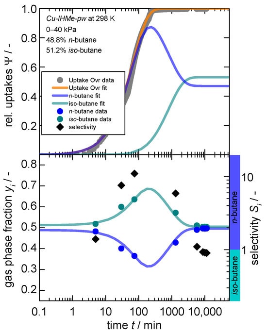 Kinetic gas uptake (top), gas phase composition (bottom, left axis) and separation selectivity (bottom, right axis) in dependence of time for a “50:50” mixture1 of n-butane and iso-butane on Cu-IHMe-pw for a pressure jump of 0–40 kPa. Additionally, the overall gas phase compositions and sorption kinetics are modeled via the “GO” model [66] and a mass balance. Within the bottom graph, a selectivity larger than 1 indicates a preference for n-butane as indicated by the additional colored ribbons. 1. Please note that a 50:50 molar mixture was aimed for, but actual results show slight deviations with 48.8:51.2.