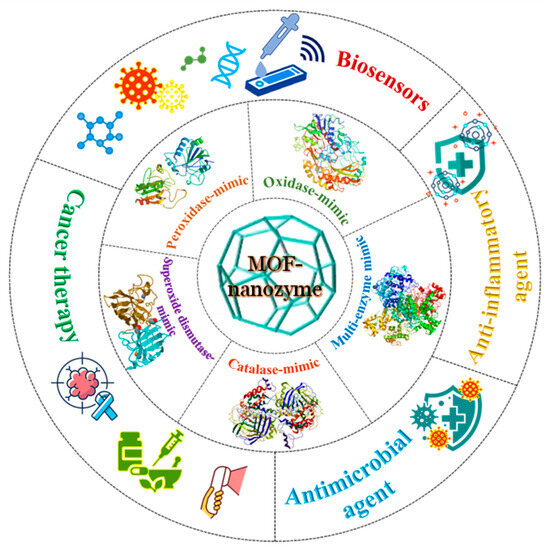 MOFs are an emerging class of porous, crystalline, inorganic–organic hybrid materials that consist of coordinated metal ions/clusters (metal nodes) and organic ligands [27,28,29]. Owing to the strong coordination between metal nodes and bridging ligands, MOFs with unique structures and flexible properties have emerged. These include the presence of (i) molecular/atomic level catalytic sites, (ii) multiple channels and ultrahigh porosity, (iii) abundant catalytic active sites, (iv) synthesis and chemical tunability, and (v) high stability [30,31,32,33]. On account of these properties, MOFs have been applied in fields ranging from chemical catalysis, biochemical analysis, sensing, energy storage, gas separation, antimicrobials, drug and gene delivery, and so on [34,35,36,37,38,39]. In recent years, MOFs have become promising candidates in bio-catalysis due to their intrinsic nanozyme activity and ability to facilitate enzyme immobilization [34,40]. Compared to traditional nanozymes, MOF-NZs possess the potential to create a diverse range of nanozymes due to the versatility of metal ions and organic linkers. Their regularly arranged unit cells offer active catalytic sites with improved enzyme mimicry, and their porous structure aids in directing substrates to these active sites [41]. Moreover, the modular nature of MOFs promotes the incorporation of various metal ions or clusters, allowing for precise control over catalytic properties [42]. By combining the therapeutic and catalytic functionalities in a single material, MOFs can also serve as excellent drug delivery carriers and play a crucial role in theranostics [43]. Owing to this, different types of MOFs, including unmodified/pristine MOFs, modified MOFs, derived MOFs, and MOFs conjugated with natural enzymes, have been investigated for their nanozyme activity [24,44,45]. Reportedly, pristine MOFs, such as Material Institute of Lavoisier (MIL)-53, MIL-88, MIL-100, and MIL-10, can exhibit excellent catalytic activity by either mimicking the natural enzymes’ active sites or by polyvalent elements [46]. Their modified forms have been developed to add chemical functionality to the MOF interior or onto its surface by using metal [47,48] and metal oxide [47,48] nanoparticles. To further improve the catalytic activity of MOFs, their derivatives have been synthesized by employing thermolysis [49], etching [50], or pyrolysis methods [51]. In addition to this, MOF-encapsulated natural enzymes have been prepared to increase their stability under harsh conditions and exhibit superior catalytic activity than that of pristine MOFs [52,53]. Thanks to the diversity and structural tunability of MOF-based materials, MOF-based nanozymes (MOF-NZs) simulating a variety of enzyme-like activities have been developed and applied in various biomedical fields (Figure 1).