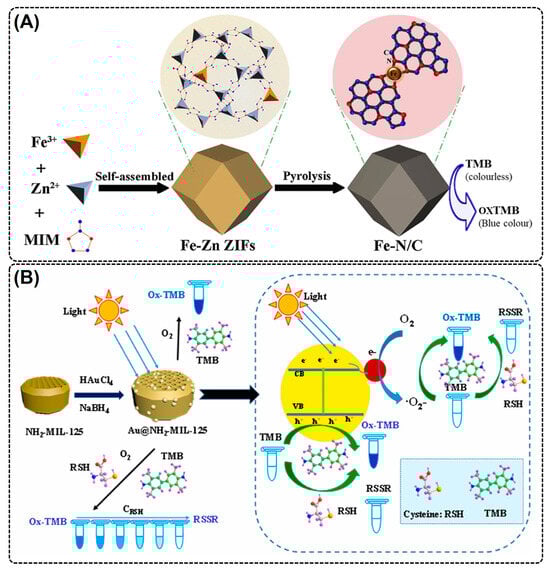 OX-mimic activity of MOF. Schematic illustration showing OX-mimic activity of (A) Fe-N/C ZIF MOF synthesized by precipitation and pyrolysis method. Reproduced with permission from [80] and (B) light-responsive AuNPs@NH2-MIL-125(Ti) MOF composite, wherein the AuNPs provided a high photocatalytic activity by photo-generated charge transfer and separation. Reproduced with permission from [81].