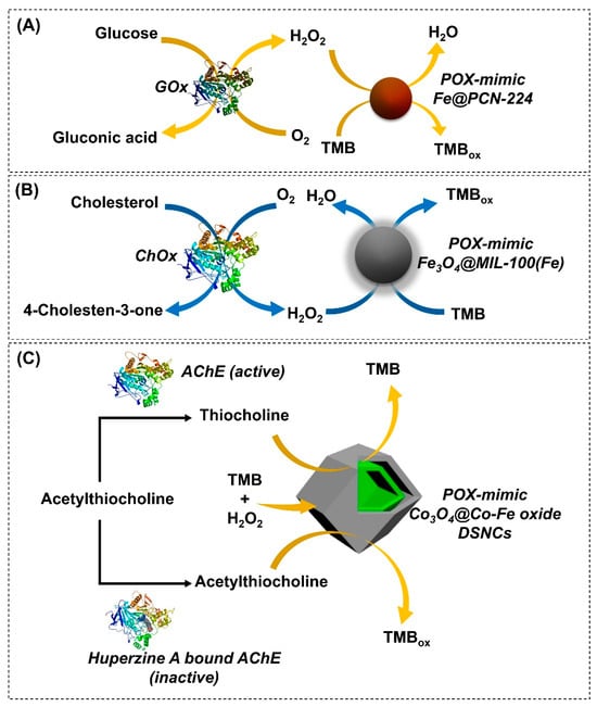 MOF-NZ-based colorimetric biosensors. Schematic illustration of (A) glucose and H2O2 detection by employing GOxFe@PCN224 MOFs. Adapted with permission from [120]; (B) cholesterol detection by employing ChOxFe3O4@MIL-100(Fe) MOFs. Adapted with permission from [61]; and (C) AChE activity detection in the absence and presence of huperzine A (AchE inhibitor) by utilizing Co3O4@Co-Fe oxide DSNC MOFs. Adapted with permission from [65].