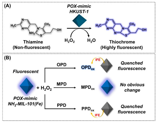 MOF-NZ-based fluorescence biosensors. Schematic illustration of (A) thiamine detection by utilizing HKUST-1 MOFs. Adapted with permission from [165] and (B) detection and differentiation of o-pheyldiamine (OPD) from other aromatic amines (e.g., p-phenylenediamine (PPD) and m-phenylenediamine (MPD)) using POX-mimic NH2-MIL-101(Fe). Adapted with permission from [163].