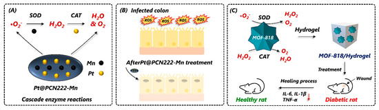 SOD is a crucial enzyme that carries out the simultaneous oxidation and reduction of unstable and toxic ROS, such as 1O2, O2·− to H2O2, and is widely used for the treatment of ROS-induced health problems. However, the in vivo deployment of these enzymes has a few major challenges, including low storage stability, susceptibility to enzymatic aggregation and degradation, poor pharmacokinetics properties, and limited cellular uptake [83,84]. To overcome these challenges, immobilization or encapsulation into the porous matrix has been widely practiced. The encapsulation of SOD on porous MOFs using a biomimetic mineralization strategy increased the enzyme biocompatibility, stability, and activity, and is considered a promising platform for in vivo biomedical treatment of ROS-mediated health problems. Using a similar approach, Guo et al. (2022) immobilized SOD using a Zr-MOF as a precursor. The SOD@Zr-MOF showed an excellent ROS scavenging property that significantly reduced mitochondrial damage and cell death, and alleviated inflammation in the treated cells [83]. Bai et al. (2022) developed an SOD-encapsulated nanocomposite using zeolitic imidazole framework-zni (SOD@ZIF-zni) (Figure 4A) [85]. Compared to SOD, SOD@ZIF-zni showed high stability (temperature, pH, and storage), an in vitro anti-inflammatory effect, and therapeutic efficiency to treat inflammatory bowel disease [85]. Despite these merits, hybrid MOFs suffer from high synthesis costs and non-targeted action, which need to be addressed in the future. There are a few more reports which highlighted the SOD-mimic properties of MOFs and MOF composites, proving as an effective and excellent alternative to natural SOD for therapeutic applications [86,87,88]. A SOD-mimic cerium-based MOF using Ce(III) and Ce(IV) as an active site and 1,3,5-benzenetricarboxylic acid as an organic cross-linker was developed by Liu et al. (2022) for radioprotective applications against γ-radiation [87]. The Ce(IV)-MOF exhibited excellent SOD-mimic activity and demonstrated broad spectrum protection ability against γ-radiation by alleviating intracellular ROS and DNA damage without causing in vivo toxicity to exposed cells (Figure 4B) [87]. By mimicking the structural and functional attributes of natural SOD, Cu-tetrakis (4-carboxyphenyl) porphyrin MOF nanodots (Cu-TCPP-MOF NDs) were developed by coordinating Cu with N and O atoms [89]. The Cu-TCPP-MOF NDs showed excellent catalytic activity and efficiency as a ROS scavenger and catalyzed the enzymatic cascade reaction to convert H2O2 to H2O. The Cu-TCPP-MOF NDs showed a dose-dependent cellular uptake, cytoprotective ability, low cytotoxicity, and excellent pharmacokinetics and renal clearance compared to natural SOD or SOD @MOF.