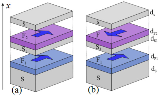 Sketch of the SF1S1F2s structure in P (a) and AP (b) orientations of magnetization. Note that the upper layer can be transferred from the superconducting state to the normal state and vice versa by changing the mutual orientation of the magnetization vectors of the ferromagnetic layers of the structure.
