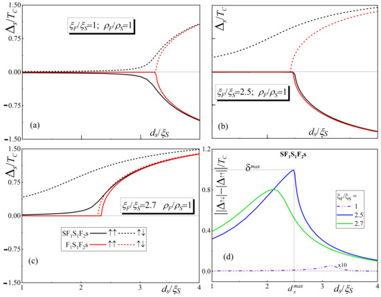 A decrease in the effective thickness of the ferromagnetic layers is accompanied by an increase in the mutual influence of the SF1S1F2 and F2s blocks. Figure 2b,c show that at and , there is a significant increase in the absolute values of . It is seen in Figure 2d that the dependence of is a nonmonotonic function of the s-layer thickness. It achieves a maximum at .