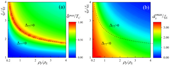 In Figure 4a, the color palette shows the values of the parameter as a function of the and ratios. The red color corresponds to the maximum values of . The blue color corresponds to the minimum values. The dashed curve divides the plane of the parameters and into two regions. In the upper-right corner above this curve, the values are positive. Below this curve they are negative.