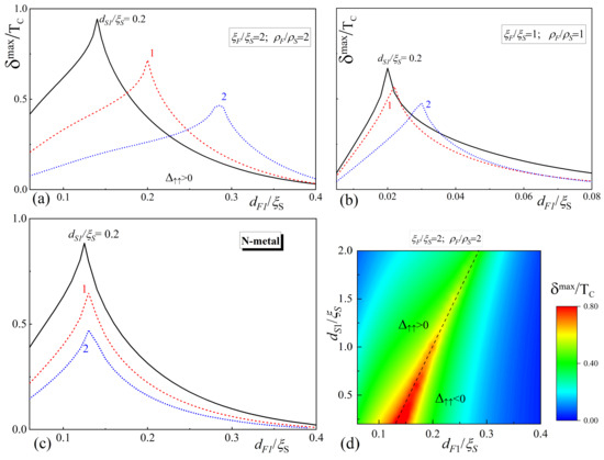 Figure 5c shows that there is no shift in the position of as increases in the case of the substitution of the S1-film by a normal metal. Due to the substitution, the regions occupied by superconductors do not change as increases. As a result, there is no shift in the maximum in the dependencies.