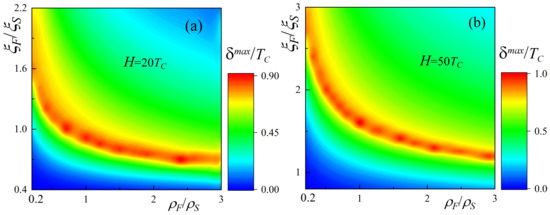 Finally, we have studied the influence of the exchange energy of ferromagnets on the triggering parameters. Figure 6 shows maps of versus the material parameters and for the values of (a) and (b), which are weaker compared to the that we used previously to obtain Figure 4a. It can be seen that the general form of the dependencies has been preserved. As in Figure 4a, there are two regions of parameters that divide the and planes into two regions that differ in the sign of . The absolute values of are rather weakly dependent on h. At the same time, the position of the high-TE region is significantly shifted with the change in H. While for strong ferromagnets , the significant TE effect appears only at and makes significant demands on the choice of materials, at , the strongest TE effect is available in the interval , which is quite reasonable for experimental realization. For convenience, all values of where is reached are not shown in Figure 6, as they are similar to those in Figure 4b.