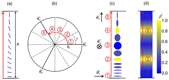A representative transformation is shown in Figure 2. In Figure 2a, we present a system subjected to conflicting boundary condition. It illustrates a uniaxial orientational variation within an LC body confined in a plane-parallel cell along the -axis of the Cartesian system, where the confining planes at and strongly impose and . At the lateral boundaries, one assumes free boundary conditions. If , the imposed frustration can be resolved by gradual reorientation of , whereby the nematic states everywhere exhibit essentially uniaxial order. These changes correspond to the rotation of the amplitude parameter space frame in Figure 2b, where the state at corresponds to , and on increasing , the eigenvector gradually reorients into On the other hand, the imposed frustration could be realized via the OR mechanism [19] when , which is illustrated in Figure 2b–d. In these figures, we label representative states of the transformation with the numbers 1 to 5. During the transformation, the amplitude order parameter remains fixed, i.e., and , which is valid for . Consequently, biaxial states must be realized within the distance h, which is shown in Figure 2d. In Figure 2c, we plot the corresponding geometric presentation of mesoscopic states. Note that OR does not require melting of nematic order. In the case shown in Figure 2b–d, we set that remains constant during the transformation. This is justifiable, deep in the nematic phase [38,41]. One sees that due to topological reasons, the negative uniaxial state along must be realized in between (number 3 in Figure 2b–d). Furthermore, this state takes place between the two regions exhibiting maximal biaxiality (i.e., see the numbers 2 and 4 in Figure 2b–d). Note that uniaxial states exhibit locally cylindrical symmetry, which is broken in biaxial states.