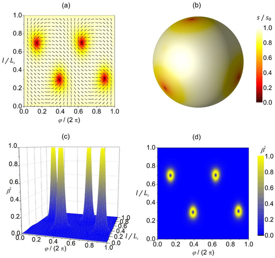 In Figure 3, we plot a reference configuration on a spherical shape in terms of 2D- (Figure 3a,b) and 3D (Figure 3c,d)-order parameters. The equilibrium configuration hosts four TDs that reside in the vertices of a hypothetical inscribed tetrahedron (Figure 3a,b) to maximize their separation, since TDs with the same charge repel each other [26,27]. The extrinsic curvature contribution (weighted by in Equation (11b)) does not have any effect on isotropic surfaces. Therefore, on a spherical surface presented in Figure 3, the configuration is the same for any value of . In the center of TDs, the 2D amplitude of nematic order is melted (i.e., , see red patches in Figure 3a,b). In 3D presentation, these points correspond to negative uniaxial order parameters (see Figure 3d). The degree of biaxiality (Figure 3c,d) is low on most of the surface because the condensation free-energy term favors uniaxial states. The cores of TDs exhibit uniaxial states, as evidently shown in Figure 3d. The centers of defects are surrounded by strongly biaxial states exhibiting volcano-like profiles, with circular rings exhibiting maximal biaxiality in presentation.