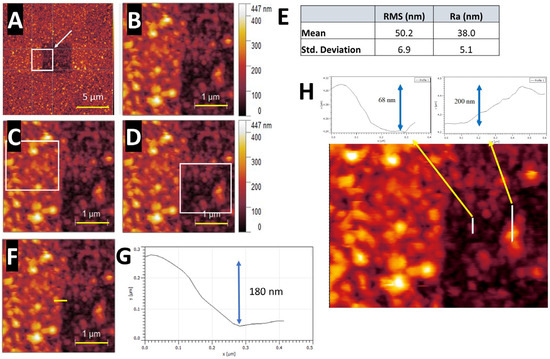 (A) A 20 × 20 µm scan with the cropped region of the 5 × 5 µm previously scanned area overlapping the non-previously scanned area; the scale bar represents 5 µm. White square and arrow highlighting the cropped region. (B) A 3.6 × 3.6 µm cropped area, (C,D) 1.5 × 1.5 µm measuring roughness. Roughness values in Table (E) measured in the region of the white squares, (E) table of roughness values, mean ± SD, n = 5, (F) scan marked with plot measurement from (C,D) the inset, and scales bars represent 1 µm (G) 2D plot over the edge of the 5 × 5 µm previous scan taken from the yellow line in (F). The different in height between the indented and non-indented nanostructures shown by the blue arrow, and (H) inset the 2D plots comparing the roughness of one of the highest nanostructures to one of the lowest in the previously scanned region. White lines indicating the region of each plot, and blue arrows indicating the difference in the indented nanostructures height.