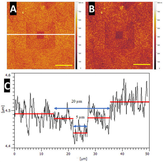 A 50 × 50 µm scan at a 0.5 Hz scan velocity: (A) 512 × 512 pixels, (B) 1024 × 1024 pixels, scale bars represent 10 µm, (C) plot taken across indents, and the scan path was from left to right, as marked in (A) by the white line. Red lines in (C) taken at median of y-axis variation. Blue arrows indicating the indented region of the previous scan of 5 and 20 µm. Scale bars represent 5 µm.