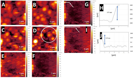 Contact mode height scans at (A) 5 × 5, (B) 6 × 6, (C) 7 × 7, and (D) 8 × 8; the insert circle represents the size of the 5 µm diameter spherical tip; (E) 9 × 9 and (F) 10 × 10 µm at SetPoint forces of 320, 370, 420, 470, 5200, and 520 nN, respectively; (G) 520 nN scan post-5200 nN scan. The white line indicates where the plot (H) was performed highlighted by the white arrow, (H,J) the plot shows the indentation region of the nanostructures, and (I) is the scanned image from (G) cropped down from 10 × 10 µm to 9 × 9 µm. The arrow indicates where plot (J) was performed, and the scale bars represent 1 µm. The blue arrows indicate the height difference between the indented nanostructures and the edge of the scan where the nanostructures are not indented.