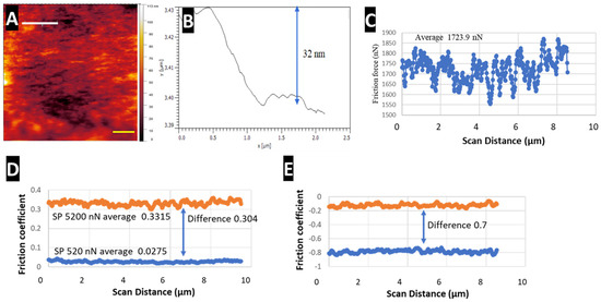 (A) AFM scanned image (scale bar represents 1 µm) and (B) corresponding 2D plot detailing the z-axis distance of the nanostructure collapse across the edge of the 520 nN SetPoint scan performed after the 5200 nN SetPoint scan across the white line (top left corner) in Figure 8A. The blue arrow in (B) measures the height difference. (C,D) Friction force and Lateral deflection plots across the 5200 nN SetPoint scan and (E) a plot comparing friction coefficients of the 5200 SetPoint and the following 520 nN scan. The blue arrow in (D,E) showing the lateral trace and retrace difference.