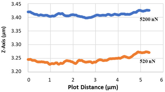 The plot of roughness is shown on the 5200 nN scan (blue) vs. the following 520 nN scan (orange).
