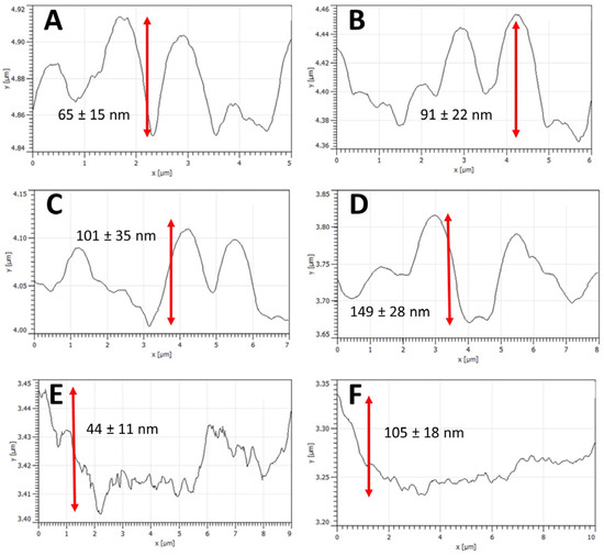 Graphs derived from height scans captured along the horizontal midpoint of the imaging scan, as illustrated in Figure 6. Two-dimensional plots were acquired horizontally across the center of six height scans, with the scan area and SetPoint force setting progressively increasing. Figures (A–D) display increasing heights in topological features, along with an increase in both RMS and Ra roughness, as numerically shown in Table 1. This increase is due to greater penetration of the tip on the increased SetPoint force into the nanostructure array. A large increase in the SetPoint force aimed to disrupt the nanostructure topography results in a change in the nanostructure pattern and a drop in topological feature height, as shown in Figures (E,F). (A) A plot was performed over a 5 × 5 µm scan measured with a SetPoint force of 320 nN, (B) which was measured over a 6 × 6 µm scan with a 370 nN SetPoint force, (C) a 7 × 7 µm scan with a 420 nN SetPoint force, (D) an 8 × 8 µm scan with a 470 nN SetPoint force, (E) a 9 × 9 µm scan with a 5200 nN SetPoint force, and (F) a 10 × 10 µm scan with a 520 nN SetPoint force. The red arrows displaying the height difference between nanostructure maxima and minima.