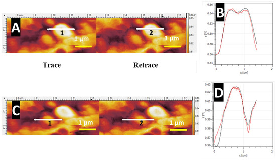 Figure 12 illustrates lateral deflection trace and retrace plots showing minimal variations in relation to each other. Frequently, the lateral deflection trace and retrace exhibit height differences corresponding to directional variations in friction values. Figure 13 exemplifies this phenomenon over a single nanostructure. The trace and retrace differences are approximately 0.02 V, with a calculated friction force and a SetPoint force of 200 nN equaling 4 nN of friction force. The retrace (red) again displays noisier behavior on the horizontal plane areas of the plot and smoother behavior on the side walls. The difference is shown in the trace–retrace scan contrast in Figure 13B. The trace scan images in Figure 12 and Figure 13 appear smoother than the higher detail present in the retrace scan images. Along with this higher detail appearing in the scanned image, higher frictional roughness or noise also appears. In the 2D plot, the trace scan, despite the noise, appears sharper and more detailed. The two peaks in the trace plot show more definition and sharper contrast, despite the smoothing and blurriness of the trace scan image compared to the retrace.