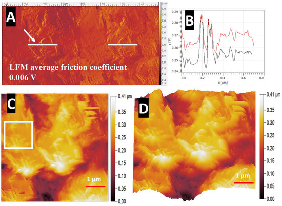 Contact mode scans shown in Figure 14 below display improved scan definition due to changing the cantilever from a spherical tip to a conical tip with a tip apex of <10 nm. Lateral Force Microscopy deflection trace and retrace scan images at 2 × 2 µm highlight an individual AMK nanostructure, showing a high contrast in the 2D plot in Figure 15B. Elevated features on the top of the nanostructure measure closely matching friction levels, as the trace (black) and retrace (red) friction coefficient in the 2D plot almost overlap each other, while the flatter areas of the nanostructure peak map have a trace–retrace difference of 0.011 V, which relates to a friction force of 0.25 nN. This is only a small change in friction. However, the contrast is most likely due to the relative uniformity of the motion of the cantilever over the elevated features, while the flat regions are at a significant angle to the horizontal plane and are visible in the 3D representation shown in Figure 14D. RMS roughness over one of these nanostructure peaks within the blue square in Figure 14C is 5.9 nm, which is considerably rough compared to the low friction force.