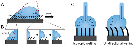 (A) Illustration of unidirectional wetting in which the receding edge is pinned to the surface, (B) the advancing front continuously spreads over the surface attempting to reach an equilibrium, (C) isotropic vs. unidirectional wetting on a nanostructured surface.