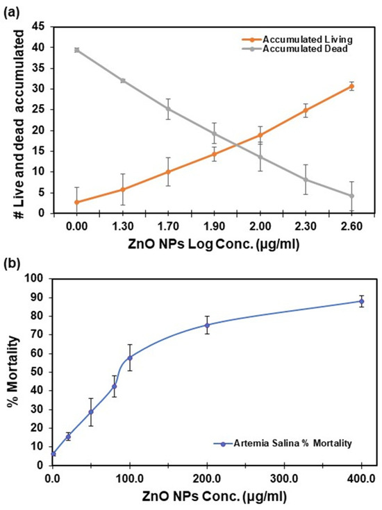 Artemia salina acute toxicity for lethal concentrations was calculated using the Reed and Muench method: (a) number of live Artemia salina brine shrimp and dead accumulated vs. log dose; and (b) percentage of mortality vs. ZnO NPs concentration. Error bars represent the mean ± standard deviation of six replicates.