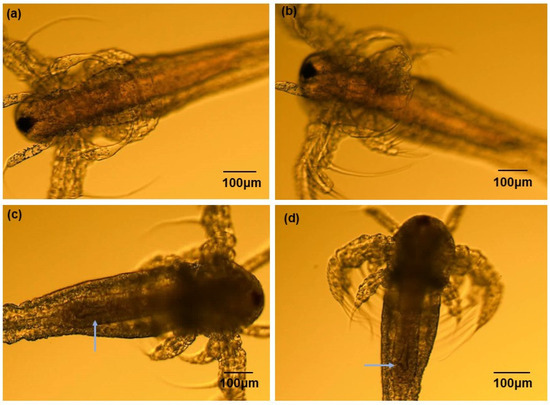 Artemia salina acute toxicity morphological changes after exposure to ZnO NPs at different concentration levels for 96 h: (a) control, (b) 2.5 µg/mL, (c) 10.0 µg/mL, and (d) 50.0 µg/mL. The arrows indicate physical malformations, including intestinal enlargement.
