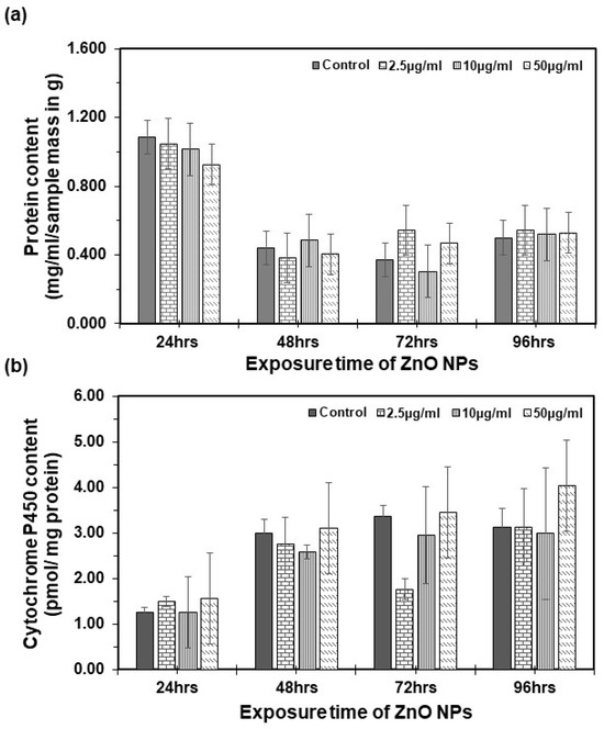Cytochrome P450 content in Artemia salina: (a) total protein content per sample determined by the Bradford method. (b) Total cytochrome P450 content as determined by Omura and Sato [30]. Each bar represents the mean of three replicates, with error bars at the top. Error bars represent the standard deviation (SD) of the mean.