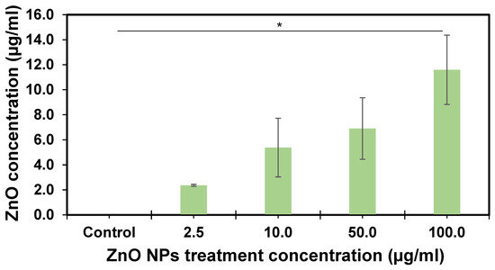 ZnO concentration in the adult zebrafish gastrointestinal tract after ten days of exposure. Each bar represents the mean of three replicates, with error bars at the top. Error bars represent the standard error of the mean (SEM). The asterisk indicates statistical differences (p = 0.02) performed by LSD to compare differences between the groups.