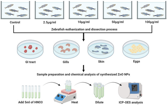Experimental settings for adult zebrafish. Zebrafish were exposed to ZnO NPs from 2.5 to 100 μg/mL per 10 days. Subsequently, the zebrafish were euthanized and dissected. The gastrointestinal tract, gills, skin, and eggs were removed for further content analysis. The concentration of zinc was determined using ICP-OES analysis. Created with BioRender.com.