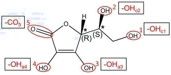 Chemical structure of Vitamin C and details about the configuration of stereogenic centers. The five anchoring groups are numbered and labeled. The * labels mark chiral centers.