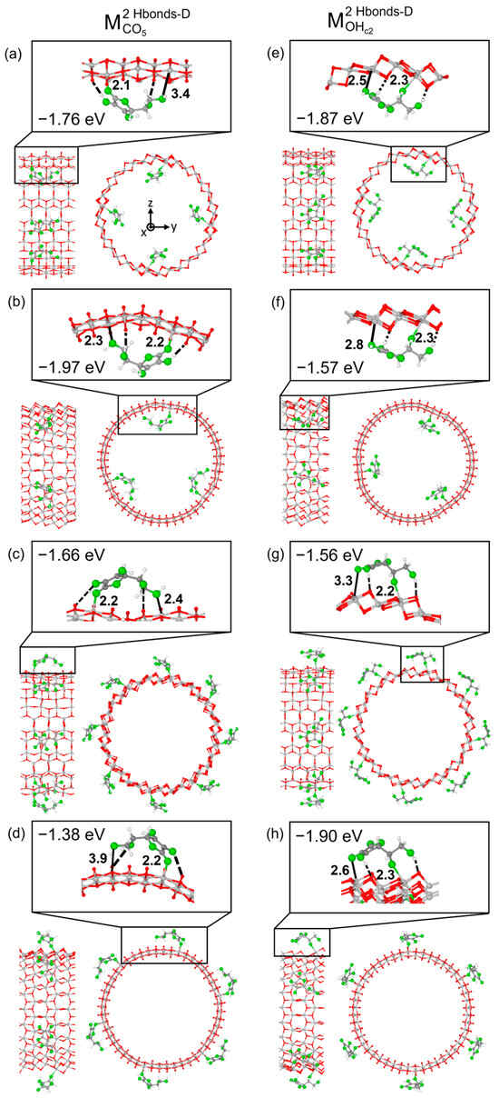 Next, we focused our attention on the B1Hbonds-D/1Hbonds-AOHc1/O(H)a3 structure, and we rolled up the surface into the nanotube with the molecules placed in the inner zone, with its long axis aligned to the axis of the TNT: this configuration was chosen in order to reproduce the same structure of the nanotube that has been investigated and reported by Ferrari and co-workers [] as the only one surface with negative strain energy.