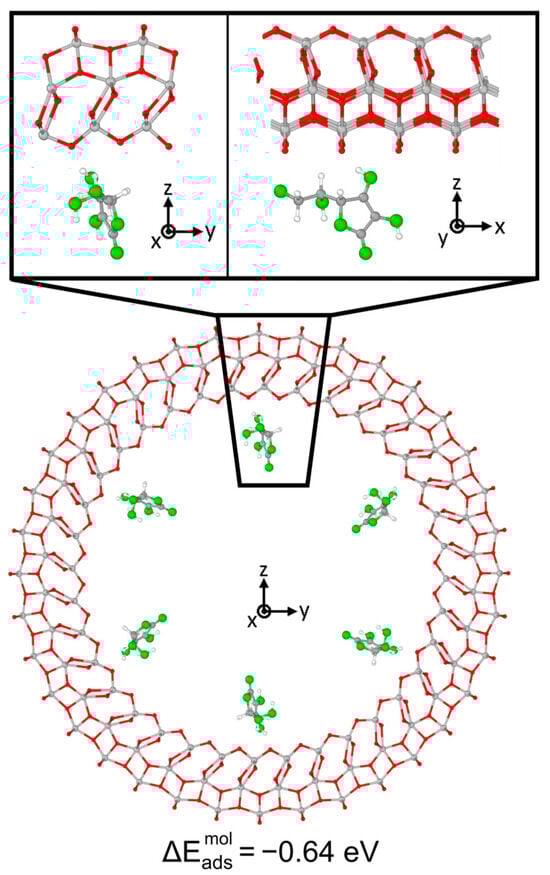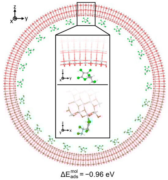 It is crucial to note that the adsorption energies and geometries of the 3L slab were similar to those of the 1L one (see data for ΔEmolads in Figure 2); the additional layers contributed to stabilizing the adsorption structure without significantly changing the overall geometry. Therefore, the adsorption behavior was similar for thin slabs, which were the main target of our analysis, and thick slabs, which were the prototypes of realistic TNTs.