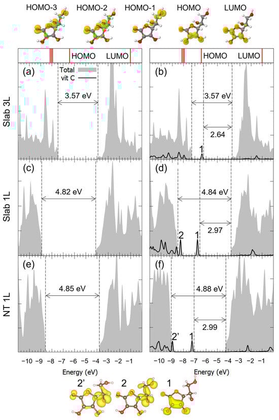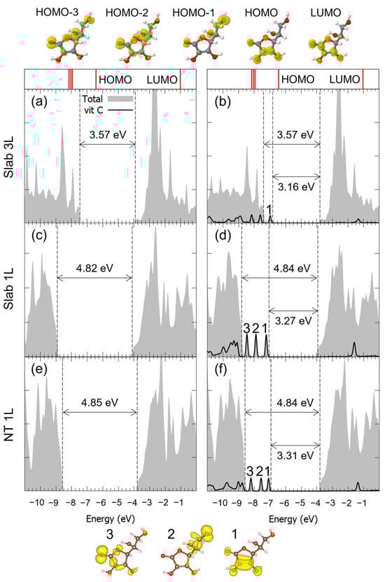 For the case of the M2Hbonds-DCO5 configuration on all three substrates, the density of states (DOS) is reported in Figure 5. We observed that, through comparison with the pristine flat or curved surfaces, the valence-band to conduction-band (VB-CB) energy gap was almost unchanged by the presence of the molecule. Also, in the case of the 1L surface, the electronic structure of the corresponding nanotube did not seem to be affected by the curvature of the TNT. Concerning Vitamin C, the DOS showed one molecular mid-gap state, which could be observed for all substrate thicknesses: both its absolute energy position and its charge density in real space allowed us to associate it with the almost unperturbed HOMO of the isolated Vitamin C molecule. At lower energies, the HOMO-n states were more hybridized with the TiO2 ones, while at higher energies, the LUMO partially retained its identity but seemed more hybridized than the HOMO.
