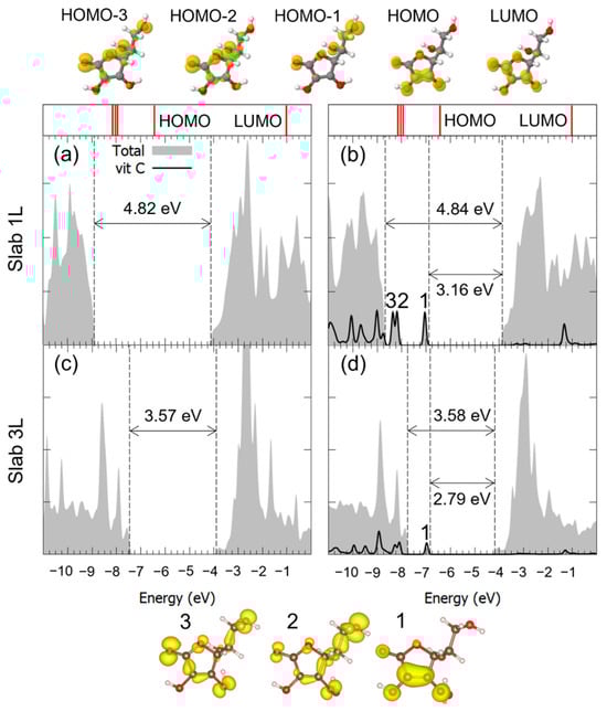 Total density of states (DOS) of TiO2 slab 1L (panels (a,b)) and slab 3L (panels (c,d)) before (left column) and after (right column) the adsorption of Vitamin C for the adsorption mode. The projection on the atomic orbitals of vitamin C is shown with a black line. The VB-CB gap and the HOMO-LUMO gap are marked by dashed lines. The zero energy is set to the vacuum level. In the upper part of the figure, the eigenvalues and charge densities of the molecular orbitals of an isolated Vitamin C molecule are represented using an isovalue of 0.001 e−/Bohr3. The states found within the TiO2 VB-CB gap are marked by numbers, and their related charge density plots are shown at the bottom of the figure with an isovalue of 0.0005 e−/Bohr3. C, H and O atoms are represented with dark gray, white and red spheres, respectively.