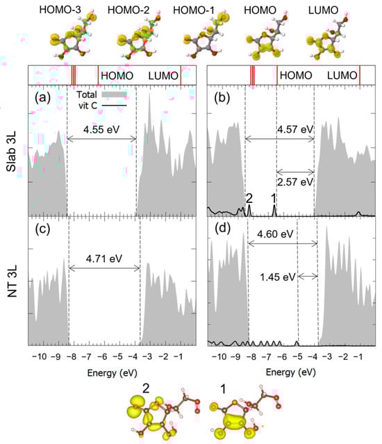 Total density of states (DOS) of TiO2 slab 3L (panels (a,b)) and NT 3L (panels (c,d)) before (left column) and after (right column) the adsorption of Vitamin C for the adsorption mode. The projection on the atomic orbitals of vitamin C is shown with a black line. The VB-CB gap and the HOMO-LUMO gap are marked by dashed lines. The zero energy is set to the vacuum level. In the upper part of the figure, the eigenvalues and charge densities of the molecular orbitals of an isolated Vitamin C molecule are represented using an isovalue of 0.001 e−/Bohr3. The states found within the TiO2 VB-CB gap are marked by numbers, and their related charge density plots are shown at the bottom of the figure with an isovalue of 0.0005 e−/Bohr3. C, H and O atoms are represented with dark gray, white and red spheres, respectively.