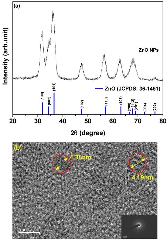 (a) X-ray diffraction patterns of ZnO nanoparticles over a 2θ range of 20–80° and (b) field-emission transmission electron microscopy of ZnO nanoparticles.