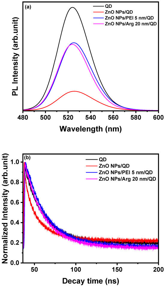 (a) Photoluminescence of QD, ZnO NPs/QD, ZnO NPs/PEI (5 nm)/QD, and ZnO NPs/Arg (20 nm)/QD. (b) Time-resolved photoluminescence of QD, ZnO NPs/QD, ZnO NPs/PEI (5 nm)/QD, and ZnO NPs/Arg (20 nm)/QD.