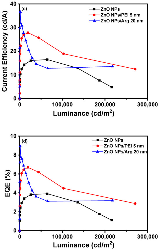 Electroluminescence characteristics of IQLEDs with ZnO NPs, ZnO NPs/Arg (20 nm), and ZnO NPs/PEI (5 nm) electron injection layers: (a) current density–voltage curves, (b) luminance–voltage curves, (c) current efficiency–luminance curves, and (d) external quantum efficiency–luminance curves.