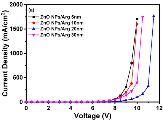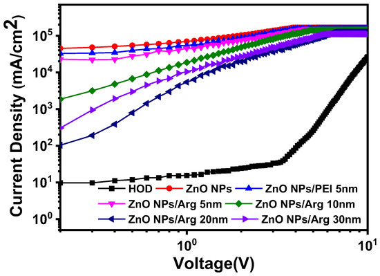 To further explore the effect of Arg on electron injection, we fabricated the electron-only devices (EODs) and hole-only device (HOD). We developed six EOD variants with different Arg thicknesses (0 nm, 5 nm, 10 nm, 20 nm, and 30 nm) and PEI (5 nm). The structures of the EODs consisted of ITO (150 nm)/ZnO NPs (50 nm)/Arg (0 nm, 5 nm, 10 nm, 20 nm, and 30 nm) and PEI (5 nm)/QD (10 nm)/Ag (100 nm). The structure of the HOD comprised ITO (150 nm)/QD (10 nm)/TCTA (40 nm)/WOx (10 nm)/Ag (100 nm). Electron injection occurred from the cathode to the conduction band minimum (CBM) level of QDs via the CBM of ZnO NPs/Arg EILs. Upon comparing the current densities of the EODs using Arg ILs with varying thicknesses to those of EODs with ZnO NPs and ZnO NPs/PEI (5 nm) ILs, in Figure 8, it was observed that, except for the EOD with a 30 nm-thick Arg IL, the energy barriers for electron injection in EODs with varying thicknesses of Arg ILs were higher than those in EODs with ZnO NPs and ZnO NPs/PEI EILs. This suggests that the insulating nature of Arg surpasses that of PEI. An EOD with a 30 nm-thick Arg exhibited a lower barrier for electron injection compared to the EOD with a 10 nm-thick Arg, indicating that the EOD with a 30 nm-thick Arg is more influenced by its inherent insulating nature than the effect of the energy barrier. The current density of the HOD was observed to be significantly smaller than the EOD current densities, suggesting that hole injection is much more challenging than electron injection.