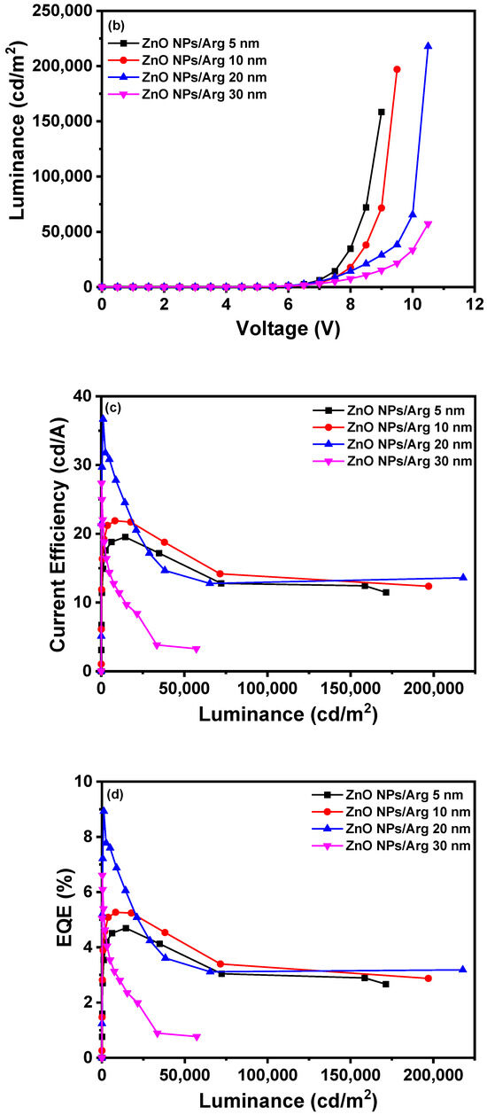 The performance parameters of IQLEDs with ZnO NPs/Arg (5 nm), ZnO NPs/Arg (10 nm), ZnO NPs/Arg (20 nm), and ZnO NPs/Arg (30 nm) EILs.