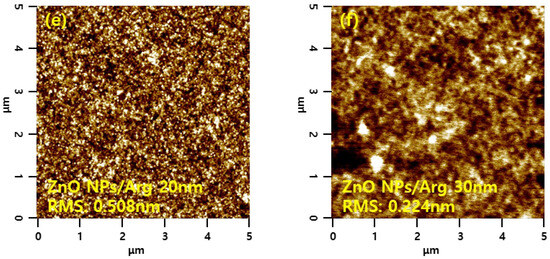Atomic force microscope images of (a) ZnO NPs, (b) ZnO NPs/PEI (5 nm), (c) ZnO NPs/Arg (5 nm), (d) ZnO NPs/Arg (10 nm), (e) ZnO NPs/Arg (20 nm), and (f) ZnO NPs/Arg (30 nm) films.