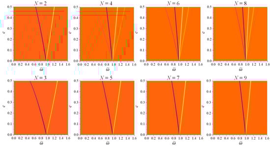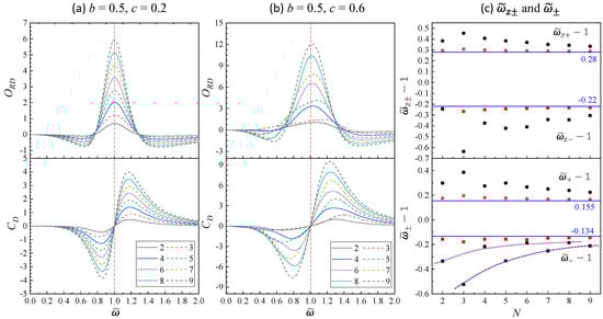 When c increases to 0.2, the spectral features in both  and  relationships become more complicated as shown in Figure 4b. For N = 3, 5, 7, and 9, the  spectra share a similar shape, featuring a positive curved band centered around  and two large negative dips near each zero-crossing location, with the width of the central band decreasing with N. For N = 2, 4, 6, and 8, the central bands are relatively narrower than their N + 1 counterparts. While the spectrum is asymmetry about , there are  zero crossings in  and  regions, respectively. Near each zero crossing, there is either a negative dip or a positive peak. Similar features are observed for the  relationship: For N = 3, 5, 7, and 9, there is only a negative dip at  and a positive peak at , with specific (, ) pairs being (0.845, 1.135), (0.895, 1.095), (0.920, 1.075), and (0.935, 1.060), respectively. For N = 2, 4, 6, and 8,  positive peaks and N/2 negative dips are evident in the spectra. Specifically, for N = 2,  and  appear at 0.895 and 1.095; for N = 4, two negative dips occur at 0.935 and 0.82, and two positive peaks at 1.06 and 1.15; for N = 6, there are three negative dips at 0.865, 0.955, 1.165, and three positive peaks at 1.12, 1.045, 0.80; for N = 8, four dips are at 0.965, 0.895, 0.79, and 1.145, and four peaks at 1.035, 1.095, 1.175, and 0.835. Clearly, the number of peaks/dips in the  plots corresponds to the number of zero crossings in the  plots.